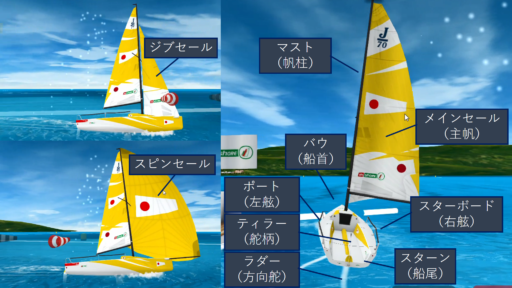 一人乗りのヨットでは、メインセールだけの一枚帆(例:ILCA級)もあります。スピンは使う艇と使わない艇があります。
