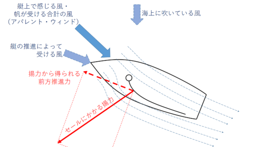 また速く走れば走るほど、船の上で感じる/帆に流れる風も速くなることで、より大きな揚力を得るため、理論的には無限に加速することになります。実際には水の抵抗や角度、ヨットの構造などによるスピード限界がありますが、風力だけで走っているにも関わらず風速の倍以上の艇速が出る高性能艇もあります。