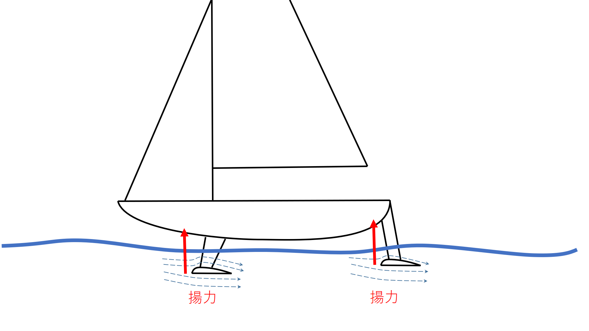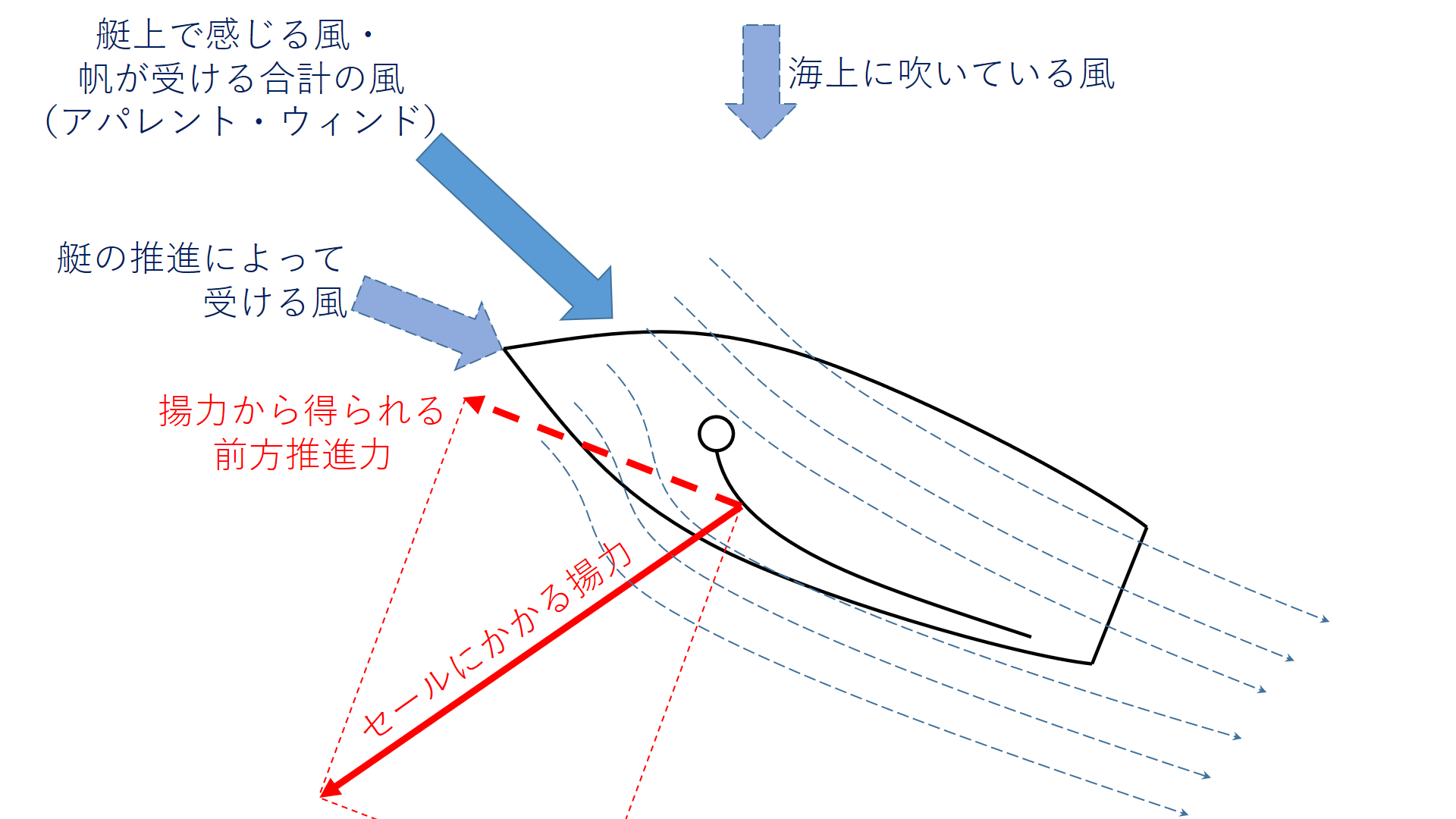 ヨットは「風に押される力」で走ることもありますが、主に「風を帆に流して、揚力で」走っています。飛行機が、翼に風を流して揚力を得るのと同じ原理です。翼や帆に流れる風が速くなるほど、揚力は強くなります。