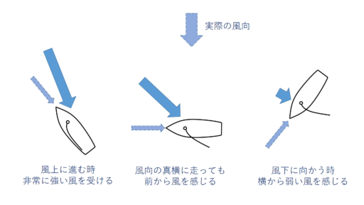 アパレント・ウィンド(見かけの風) … 推進中のヨットは、進行方向から相対的に風を受けるため、艇上で感じる風=セールで受ける風力・風速が、海上に吹いている風とは異なります。これを見かけの風/アパレントウインドと言います。自転車で向かい風で走れば、実際より強い風を感じますし、追い風で走れば、ほとんど風が吹いていないと錯覚するように、です。