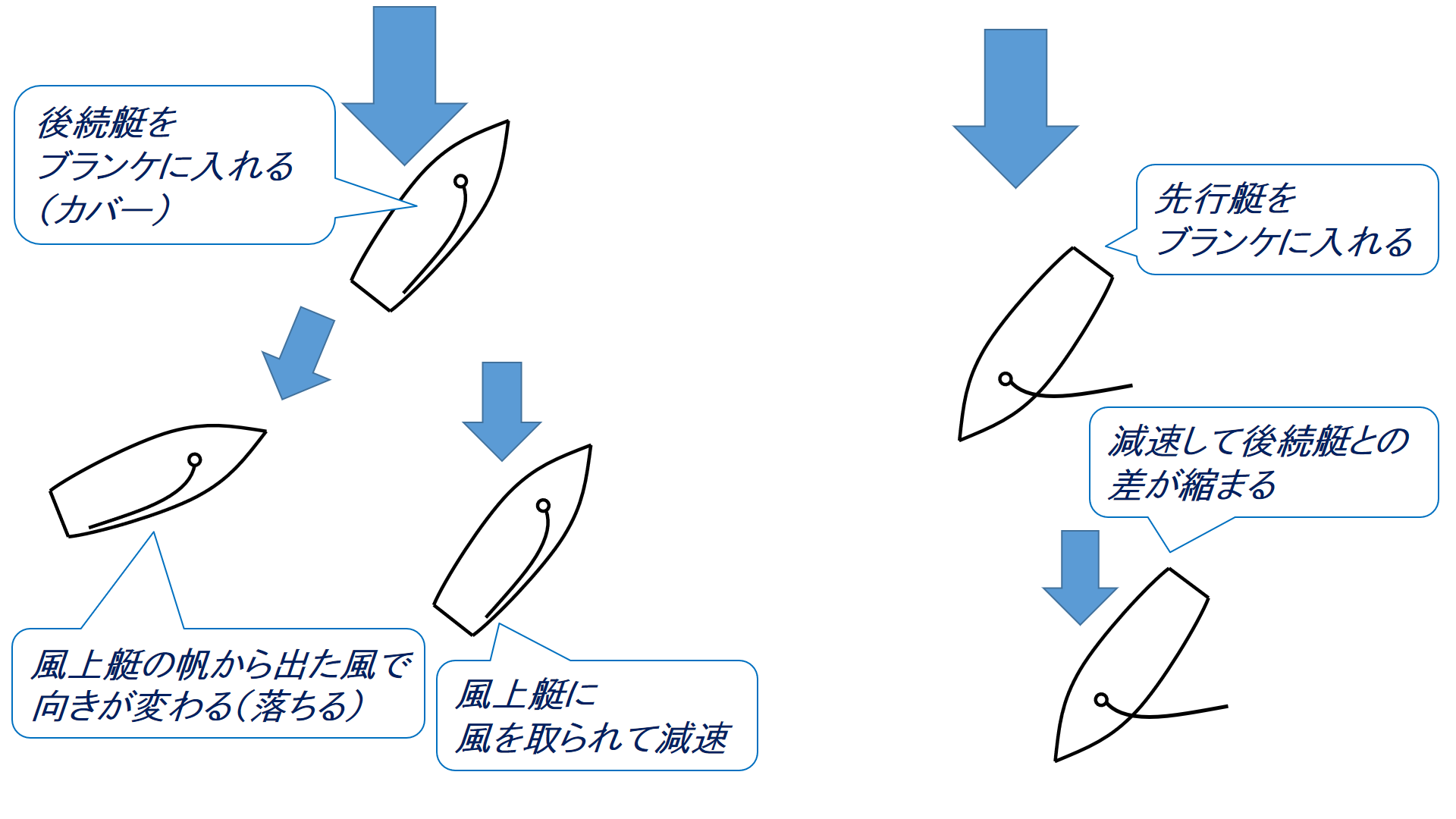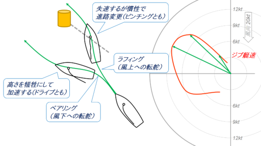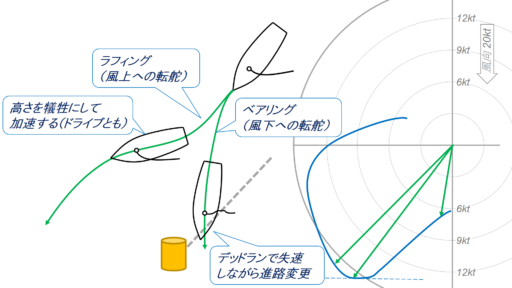 デッドラン … 真風下に向かうと、アパレントウィンドがゼロに近づき、帆に風が流れなくなり帆の揚力を失うので、大きく失速します。