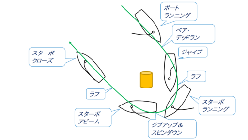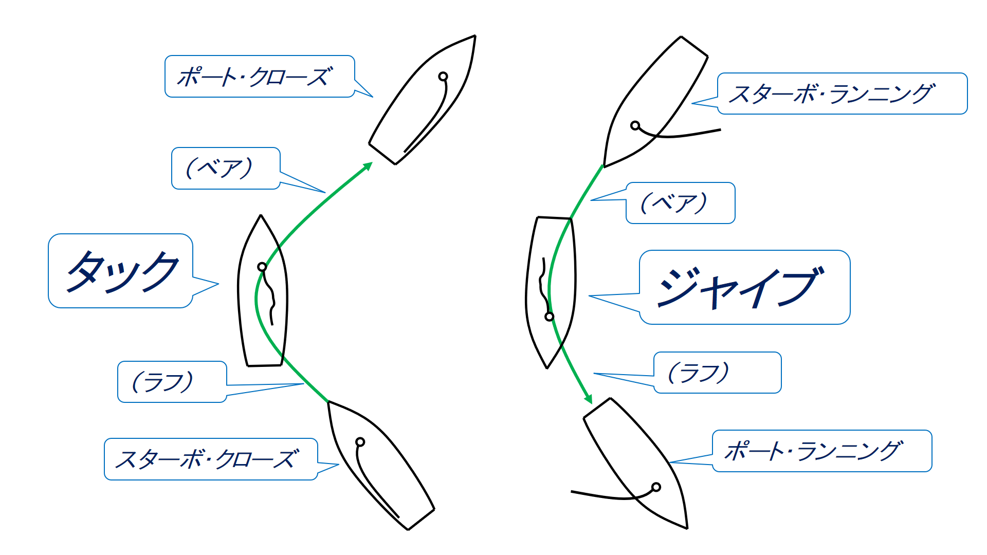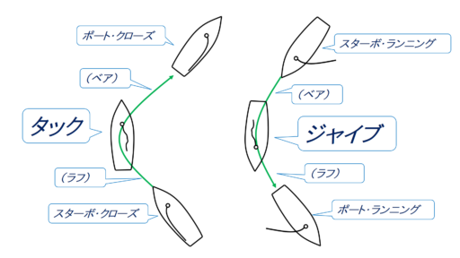 タック … クローズから真風上を向いてから逆のクローズに進路変更することをタッキング、またはタックと言います。