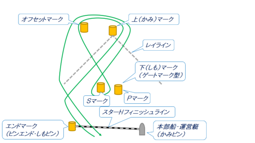 マーク … スタート/フィニッシュラインの端や、レースコースの折り返し点に設置される、アンカー(碇)で固定された大型のブイ(浮き)のことです。黄色やオレンジなどの見える色で俵型が一般的です。風上/風下の折り返し地点を上(かみ)マーク・下(しも)マークと言います。上マーク横のすぐ近くに打たれているマークは、オフセットマークと言って、上マークに向かうクローズ艇と、上マーク回航後のランニング艇が交錯する事故を減らすためのものです。下マークなど、2つ設置されて、内側から外側にどちらを回っても良いものをゲートマークといいます。ゲートマークのうち右舷(スターボ)側をSマーク、反対(ポート)側をPマークと言います。