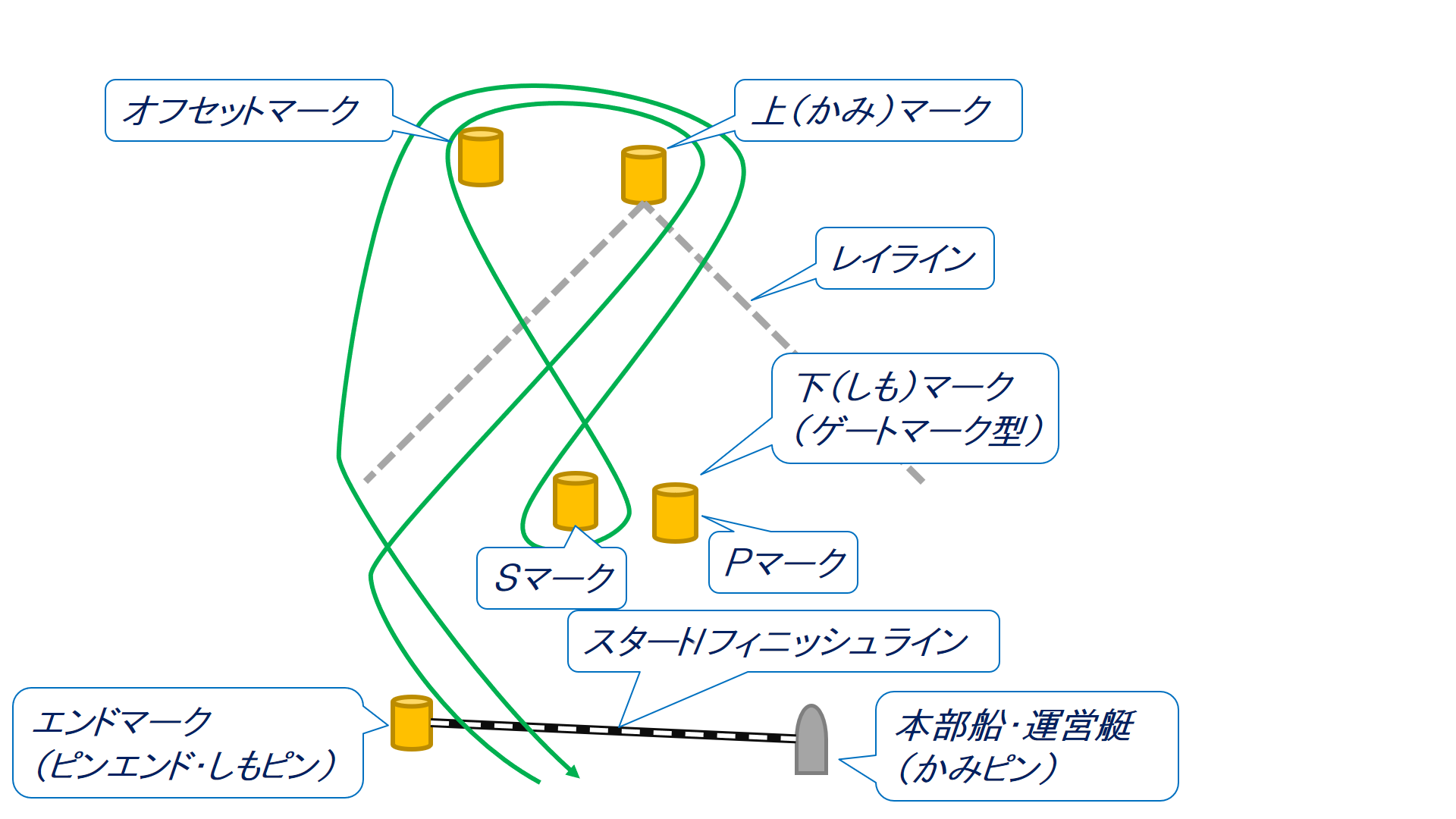 レグ … コースのマーク間区間のこと。スタートラインから第1マーク(上マーク)までの区間を1レグまたは1上(いちかみ)、上マークからオフセットマークに向かう短い区間を2レグ、またはリーチングレグと言います。