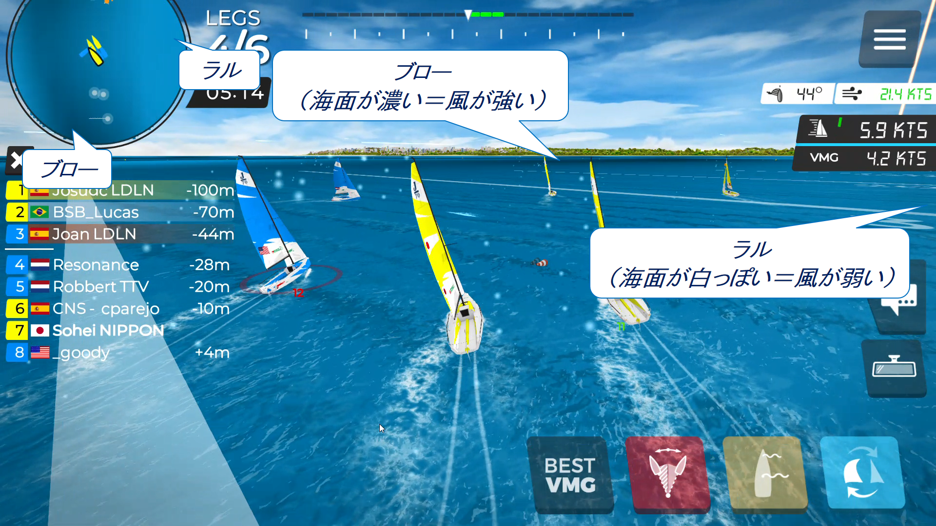 ブロー … 特に風が強い場所、風のかたまり。バーチャルレガッタでは濃い海面色で再現。レース中の会話で「あっちの遠くにブローがある」「5秒後にブローに入ります」「ブロー来い、ブロー来い、ブロー来い」と最もよく発せられる単語です。