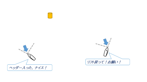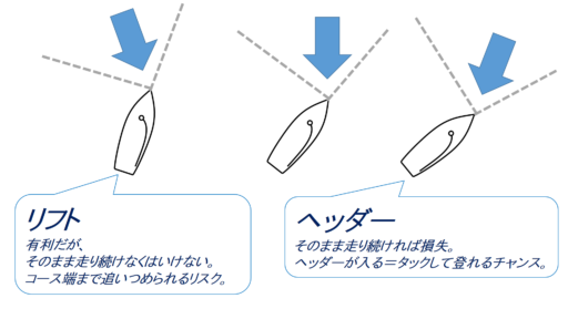 ヘッダー … クローズで走っている際に風下側にシフトして、進行方向が落ちる風向変化ですが、タックすれば登れるチャンスでもあります。コース端に寄り過ぎて、そろそろタックしたいというタイミングでヘッダーが入ると、歓喜します。また、ブローに向かうために、ヘッダーを我慢して走ることもあります。ランニングで走っている場合は、あまり落とせなくなる風上側への風向変化。
