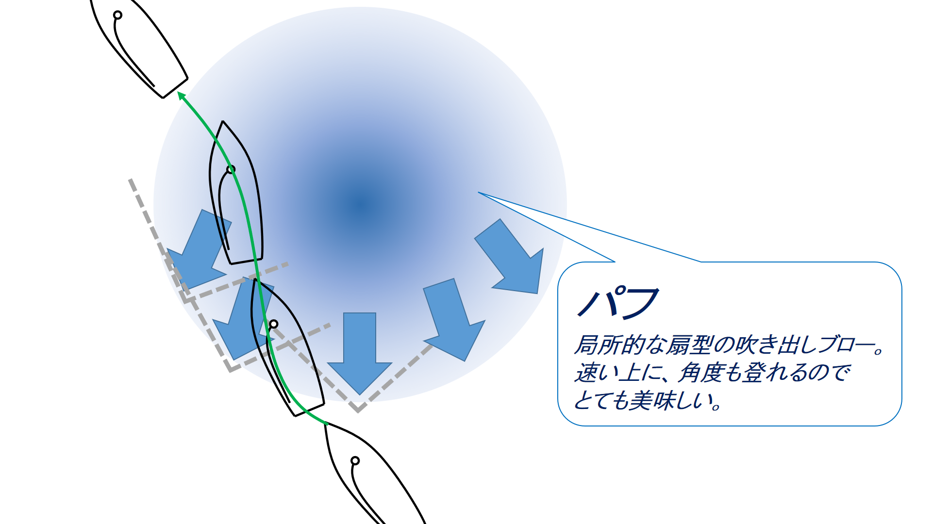 パフ … 特に円形で扇形に広がる吹き出しブロー。上手くパフの縁を走るとリフトを伴うことが特徴。