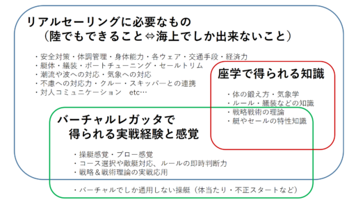 バーチャルには再現・実装されていない用語・知識も多く、十分知識ではありませんが、バーチャルの知識・経験の大部分はリアルセーリングでも役に立つ必要知識です。ぜひ、バーチャルでレース経験を積んで、いつかリアルセーリングにも挑戦して頂けることを願っています。
