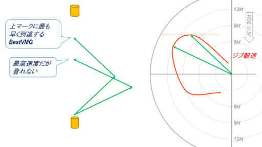 Best VMG … 艇速のうち、高さ(風に対して直上または直下に向かう)速度をVMG(Velocity Made Good)と言います。クローズまたはランニングで最も高さを稼げる(風下に落とせる)角度を、Best VMGと呼びます。