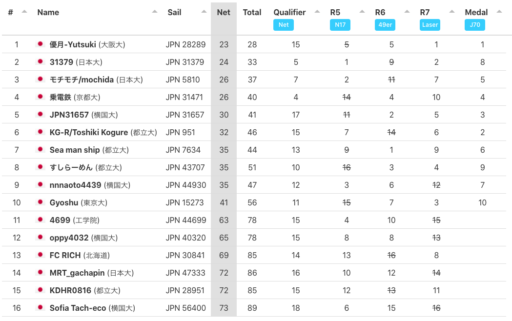 7レース目まで8点差でぶっちぎりリードしていた31379(日大)選手が、最終メダルレースで全員から激しいマークにあい、混戦を制した優月-Yutsuki(阪大)選手が、1点差での見事な大逆転優勝を果たしました。