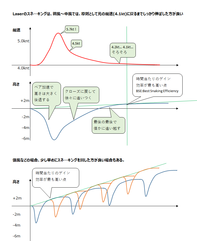 以前の仕様では、ILCAにおけるパンピング(スネ―キング、ベア加速してクローズに戻すを繰り返して、蛇行する)は、必須の操作ともいえるほど重要でしたが、21年2月頃の大きな仕様変更で、パンピング効果はほとんど無くなっています。風域・海面によっては有効なこともあるようですので、古い記述を以下に残しています。