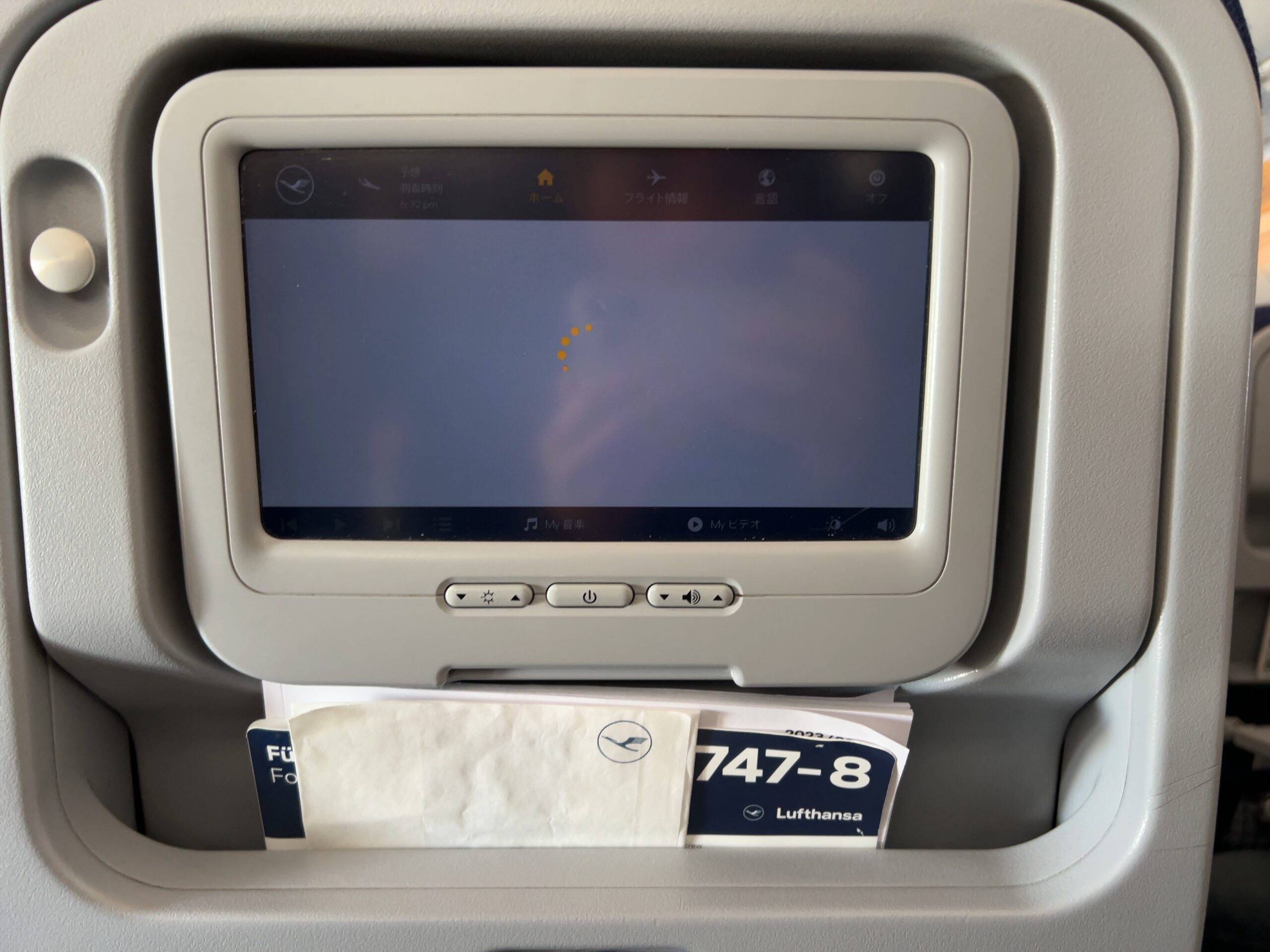 同じ列の人は使ってなかったり、同じくイヤホンジャックを見つけられていなかったりした。結局、少し離れた席の人をカンニングしてようやく見つけた。ボタンがついている肘掛けの先端についていた。あまりにも死角。だが、この位置なのには理由やメリットがあることにすぐ気づいた。