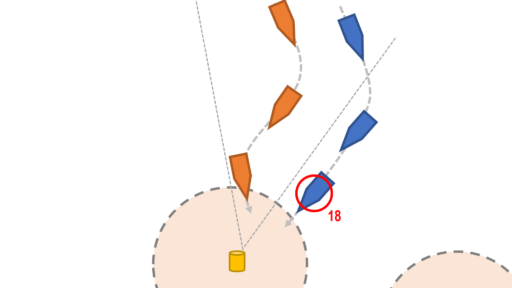 フィニッシュラインのアウターには18条のマークエリアが表示されていませんが、ルール自体はVRRSでも有効です。最後の競り合いで権利関係が逆転することが多いので注意しましょう。本部船側にはもちろんありません。