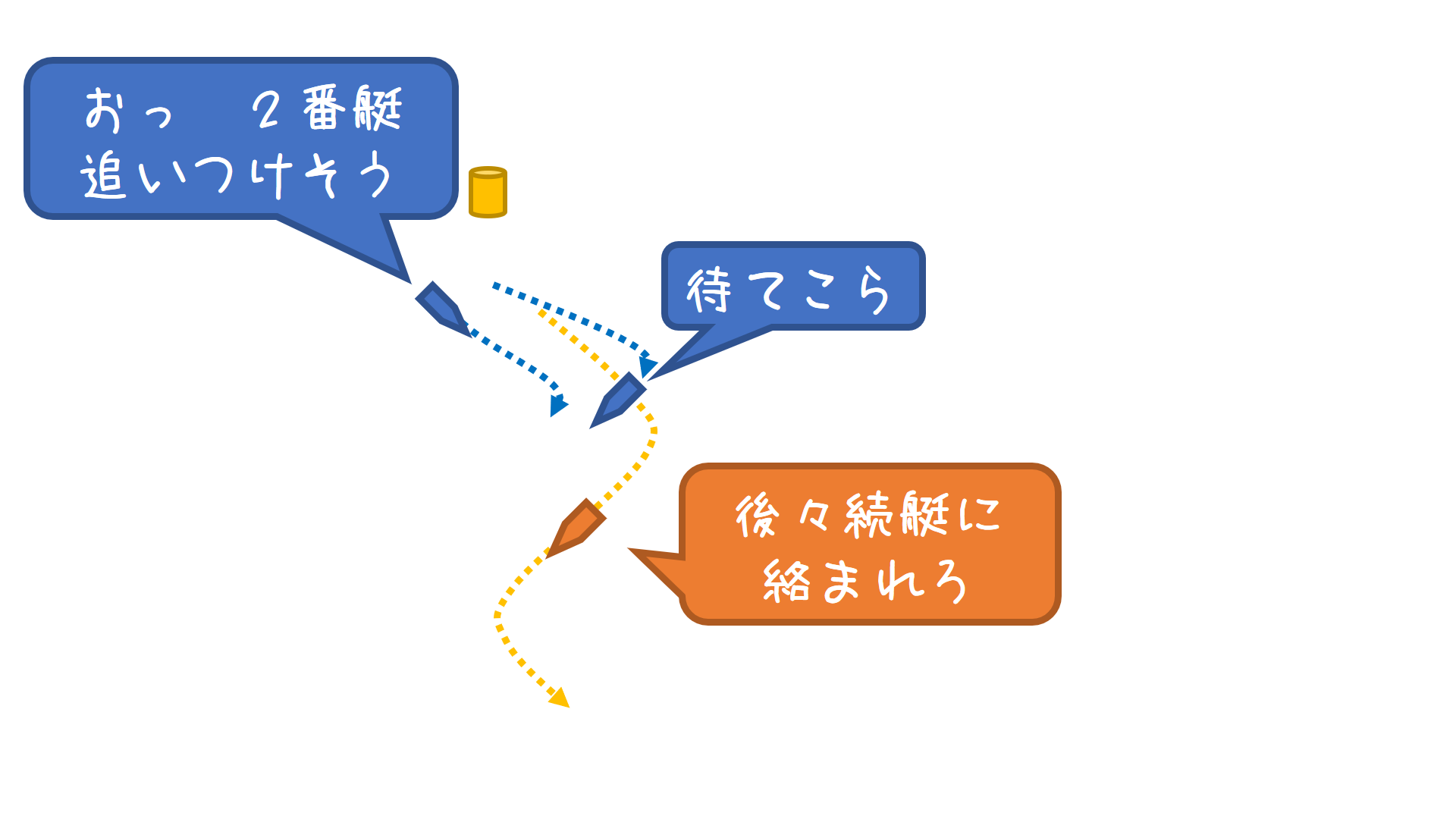 こうならないために、予め大きく逃げておくか、後々続艇を使う必要があります。