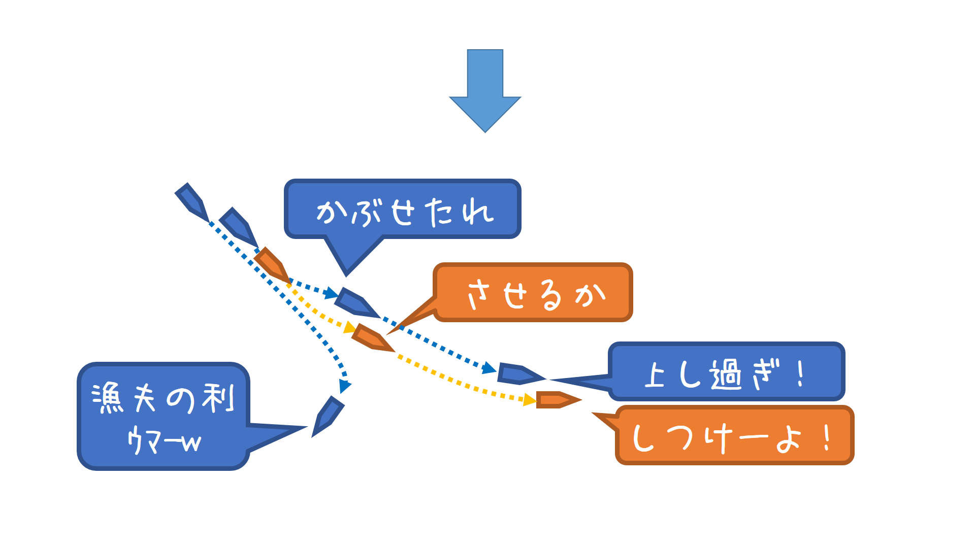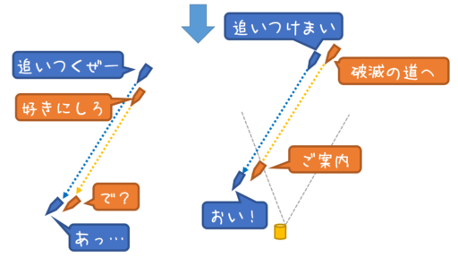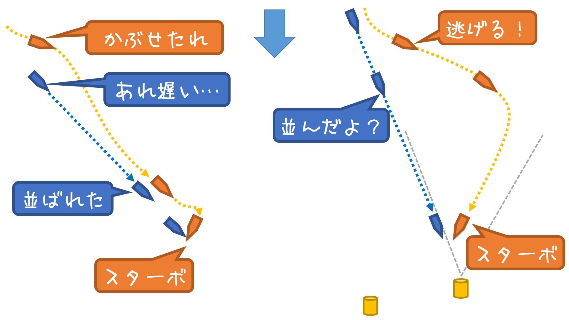 しつこい後続艇は、頭に血が上ってこちら(前)ばかり見て、後ろを意識していないことが多いので、まんまと引っかかることが多いです。また、冷静な後続艇であれば追うのを止めてくれます。