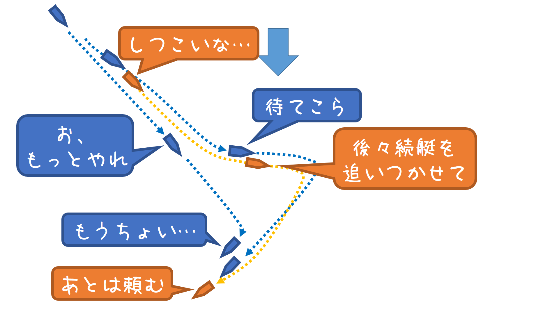 追ってくる後続艇は、後々続艇の方へ