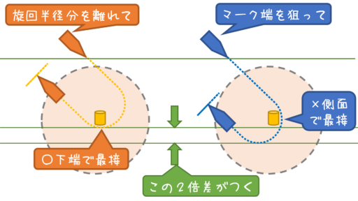 旋回半径幅をマークから離れて狙い、マークの真下を舐める