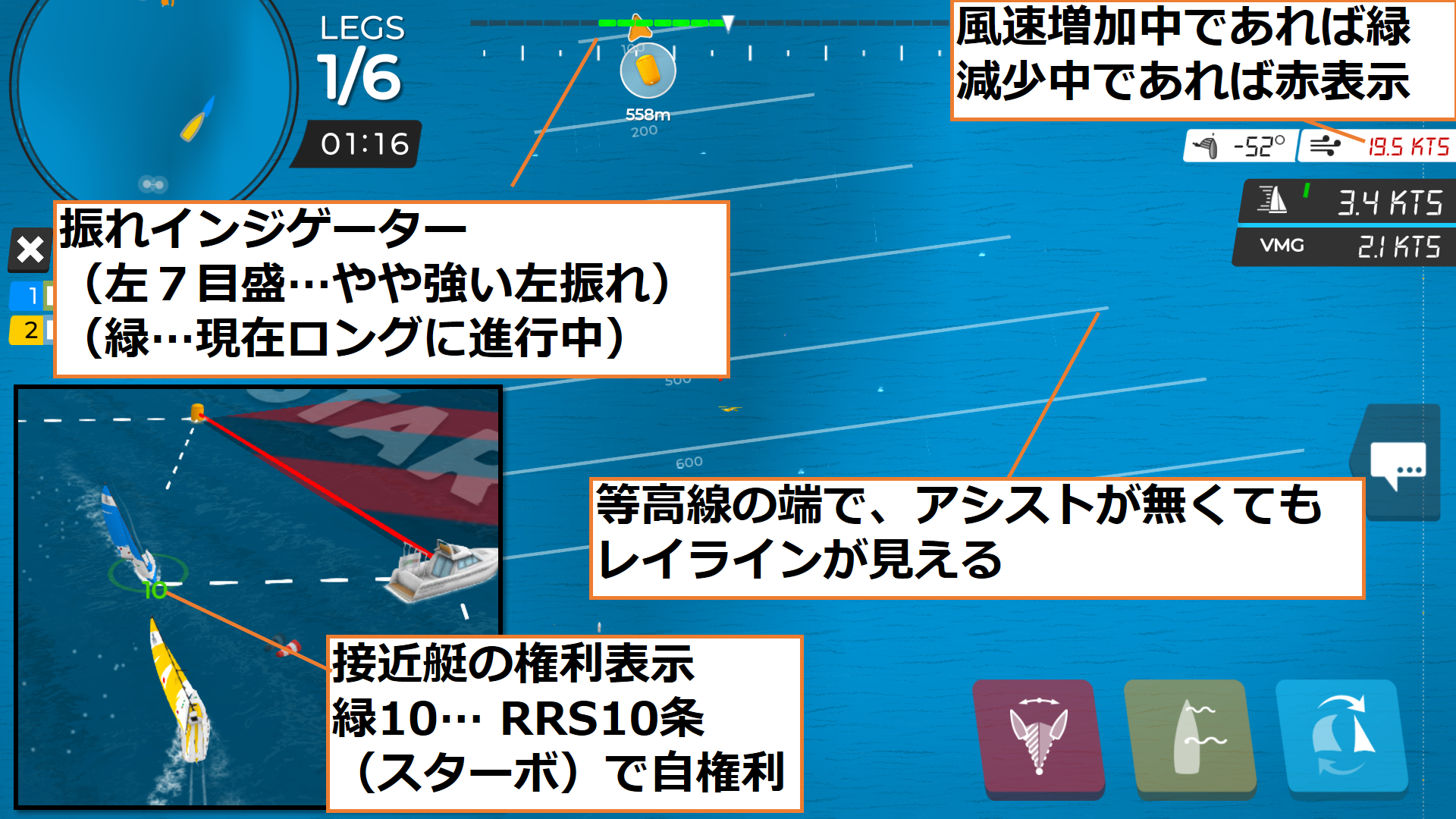 左上の俯瞰図から読み取れる情報は非常に多いです。また俯瞰図をタップすると、全体表示も真上から見た2D表示にして、ズームイン・アウトすることができます。ブローの位置や、ミートしそうな他艇との高さ比べができます。