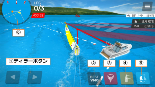 - ①ティラーボタン… 左右に舵を切ります。ティラーに対する艇の挙動はリアルセーリングに非常に近いです。押しっぱなしにすると大きく舵を切り、ちょんちょんと連打すると微調整が出来ます。