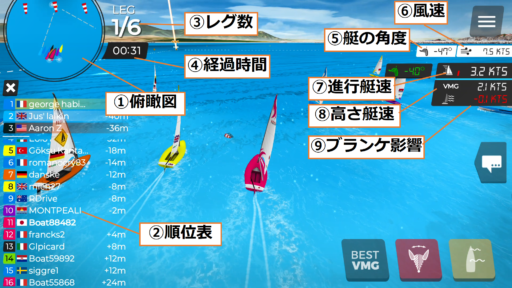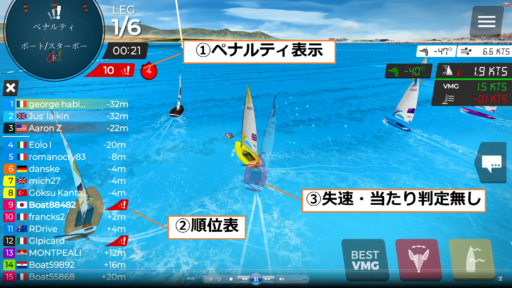 - ②順位表… 自分や他艇の順位と、艇差(メートル)が表示されています。左上の[ × ]で非表示にできます。iOSで順位を表示していると、スワイプしても視点が回転しなくなる不具合があり、これを回避するために非表示にしている人もいます。