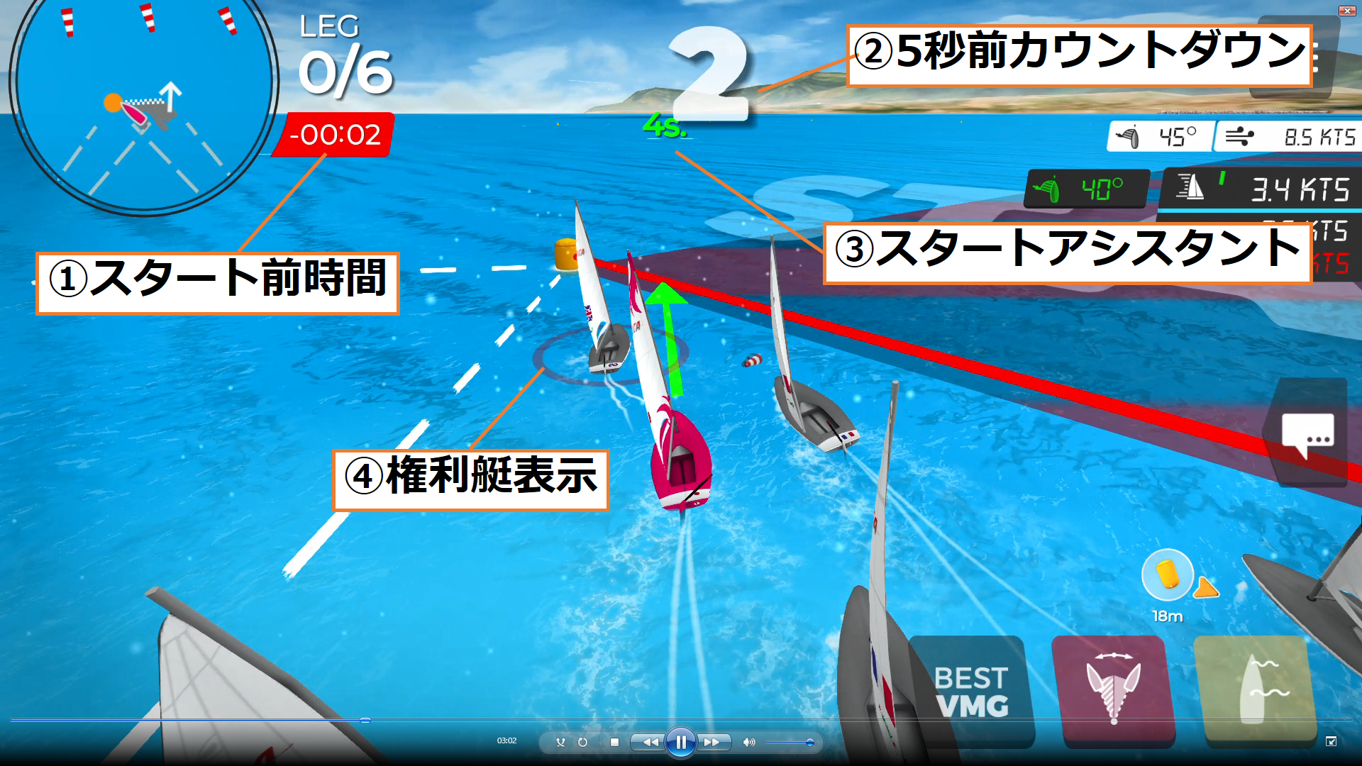 - ③スタートアシスタント… 緑トークン(最初のうちはFree)でスタートアシスタントを付けると、スタート方向と、ライン到達までの秒数が表示されます。赤は早すぎ(リコールの危険)、黄色は±1秒でちょうど良い、緑色は遅すぎ(上記写真では、スタート2秒前なのに、ラインまで4秒かかる)を示しています。赤で近づきつつ、シバーやラフで黄色に調整します。