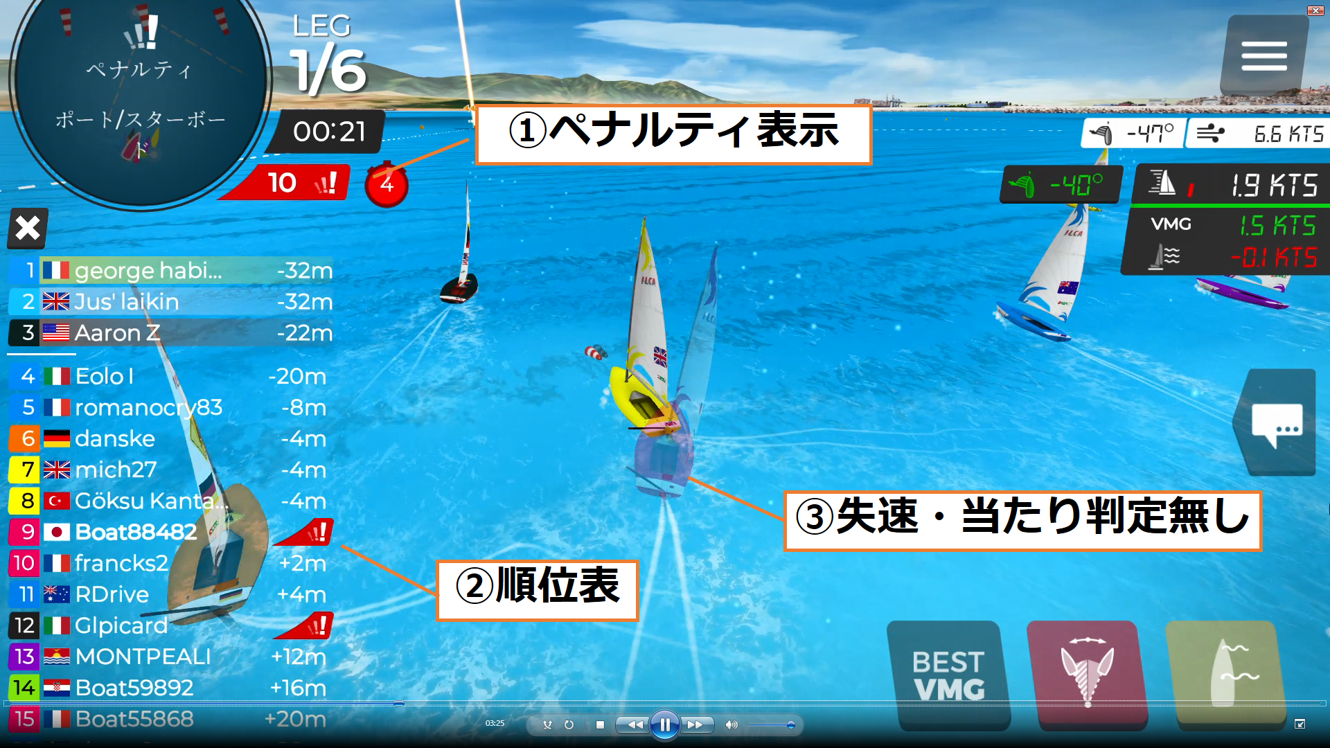 - ③艇の淡色表示… ペナ履行中の艇には、当たり判定がありません。重ねてペナを受けることも、与えることもありません。なおペナ終了し、当たり判定が復活直後(1秒内程度)に接触艇がある場合などは、1秒程度の短時間のみペナが延長されます。