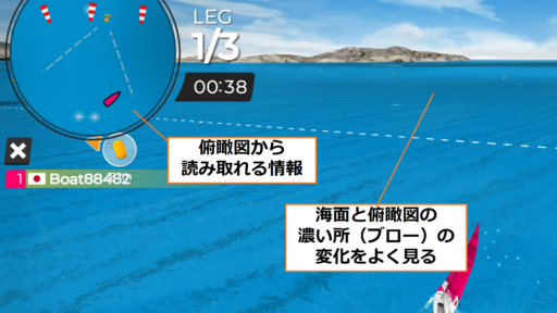 - 上りレグの最中に、次レグ終盤の下マークやフィニッシュラインの傾き、有利・不利を事前判断できます。
