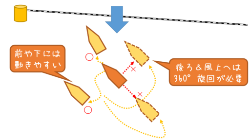 ヨットは後ろに移動するのと、風上に横移動するのが苦手です。