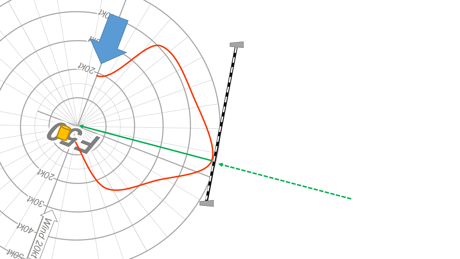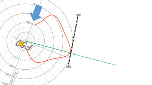 ラインを流して、傾きと有利不利を計りましょう。風は刻々と振れていますので、できれば2~3往復走りながら、振れの傾向も一緒に調べます。