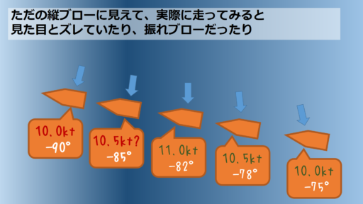 ラインを流しながらでも、止まりながらでも良いですが、一方向にゆっくり徐々に回っている風なのか、ブローによって振れているのか、激しく振れるか、ほとんど振れないか、周期は早いか遅いか、最大何度ぐらい振れるかなど、その海面の振れの傾向なども一緒に把握します。