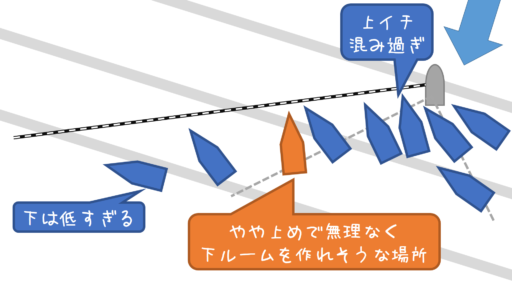 限界まで上して、上艇をイジメながら下ルームを確保します。ポートや後続からせっかく作ったルームに入られないように気を付けて下さい。