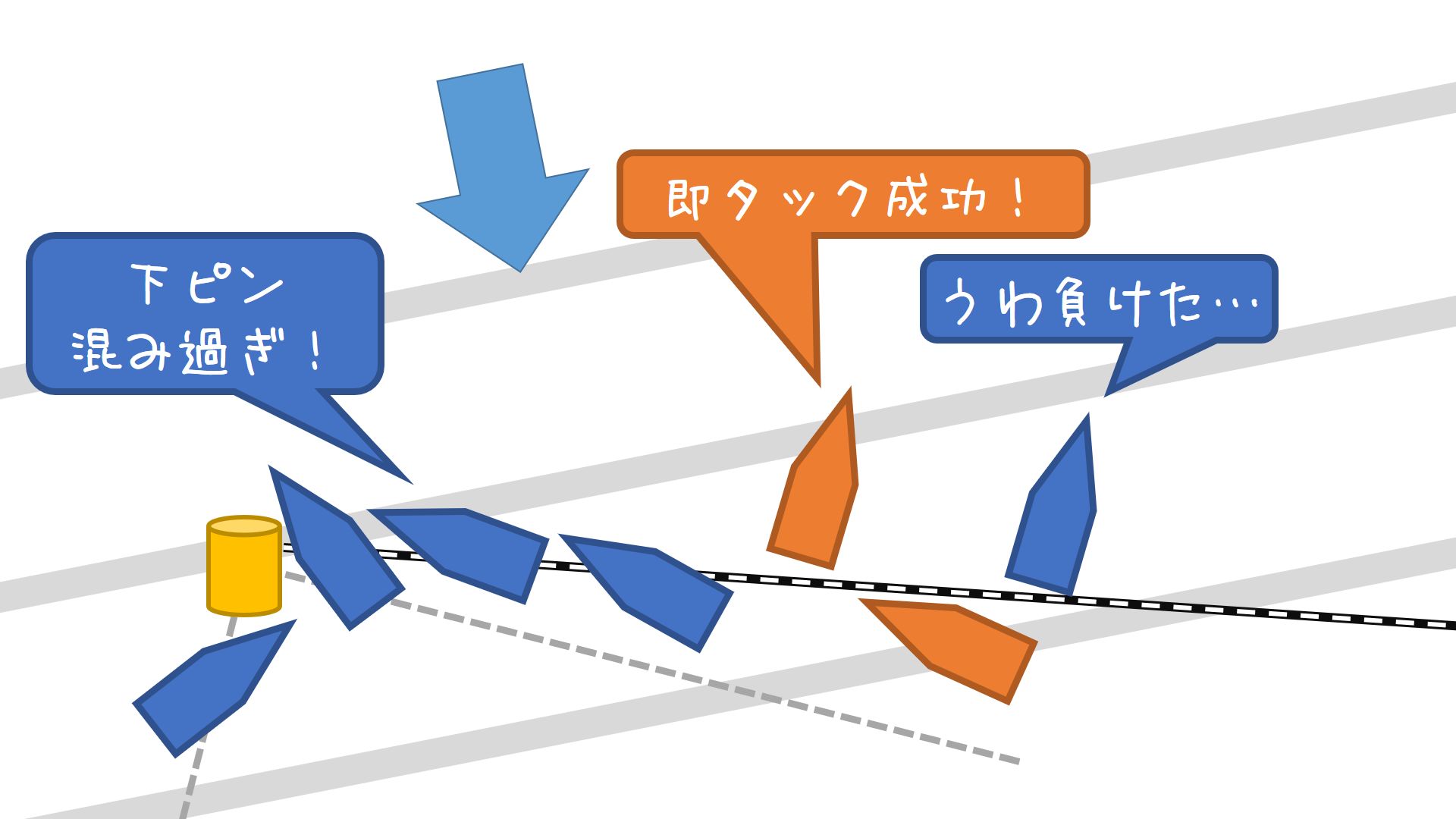 小さい左振れで、下ピンがさほど混雑せずに取れそうなら高さ重視で狙いましょう。ただし、そのままスターボショートを伸ばしたくはありません。賢い上艇なら順番にポートロングへタックを返してくれますが、返してくれないなら諦めてベアして上艇との距離を取りベアtoベアタックでディップしましょう。