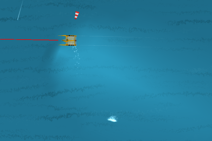 ブロー(海面の濃いところ)と、その形の変化を観察しましょう。俯瞰で見たり、ズームアウトして上マーク付近の奥のどちらからブローが降りてきそうか、想像します。
