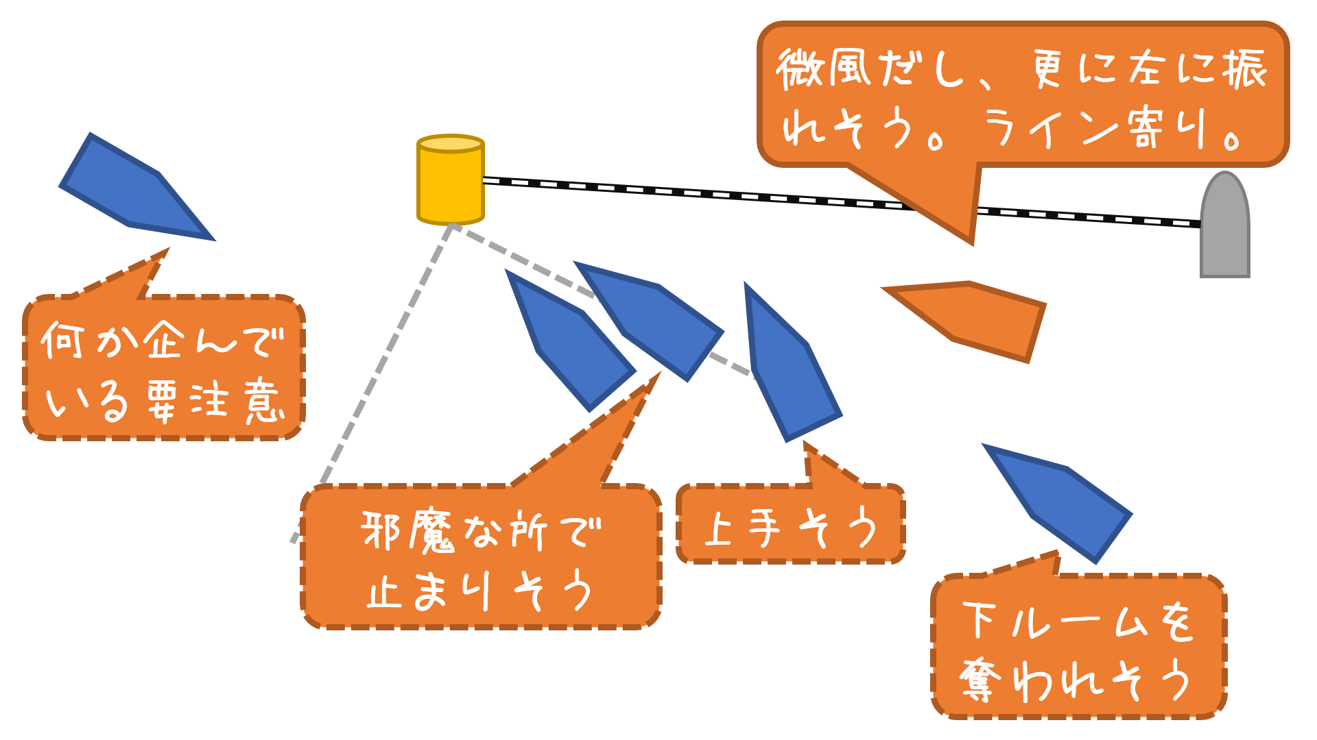 振れよりブロー重視の49erや、10kt以下の超微風で振れもさほど大きくない時、中央海面に縦ブローやパフ花道が出来ている時があります。この場合は、上スタ・下スタに拘らず、ブローをなるべくロングで長く走れるスタート位置を逆算しましょう。