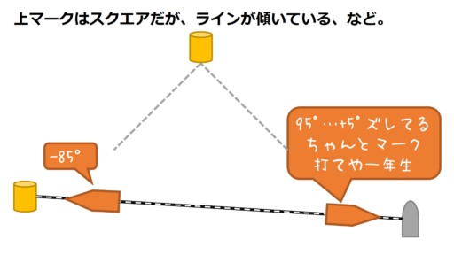 ラインの傾きと風向の傾きの差で、左振れ(前に回る)ほど上有利、風が右振れ(後ろに回る)ほど下有利です。「95°で第1マークを狙える場所」から助走を始めて直進することが基本です。