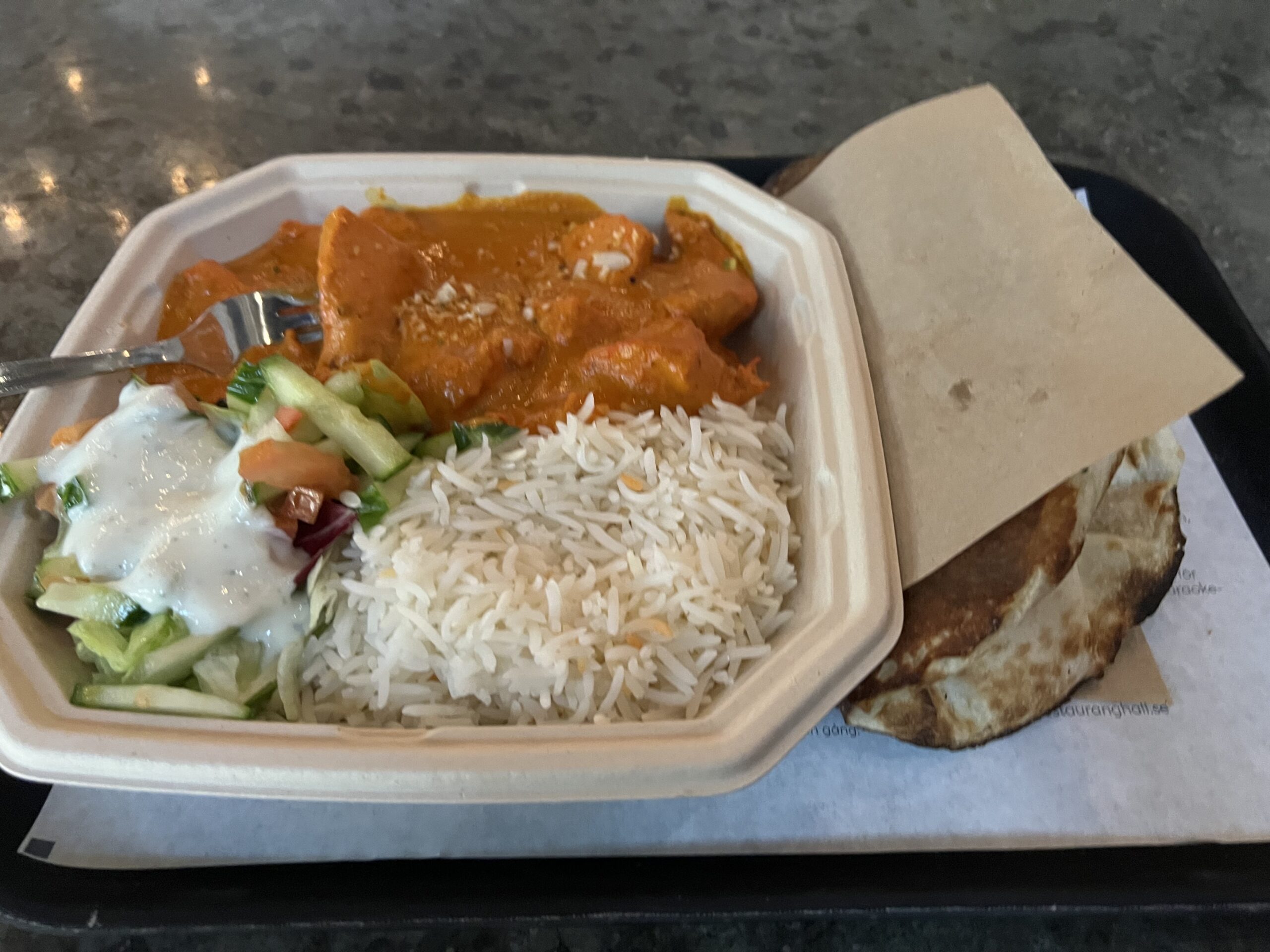 Solna 駅に戻り、ショッピングモール内のレストランを物色した。それからフードコートを見つけ、各店舗のメニューを見ていった。スウェーデンに来てからまだ一度もお米を食べていなかった私たちは、カレーライスを食べることにした。